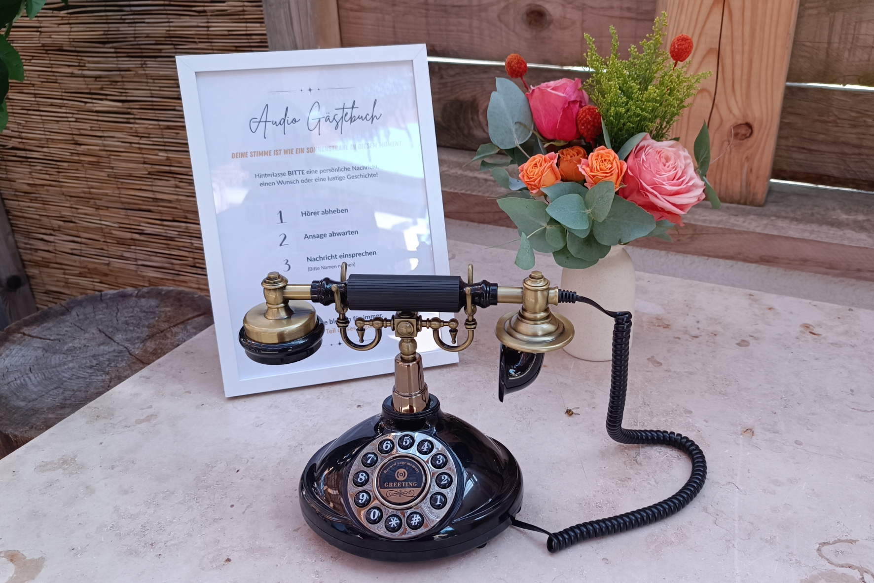 Das Audiogästebuch macht Erinnerungen hörbar: Anstatt in ein Gästebuch zu schreiben, sprechen Ihre Gäste liebevolle Wünsche, witzige Anekdoten oder persönliche Grüße direkt ins Telefon. Sie erhalten alle Nachrichten als Audio-Dateien und können diese einzigartigen Stimmen jederzeit wieder anhören.